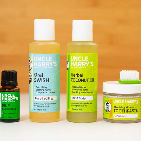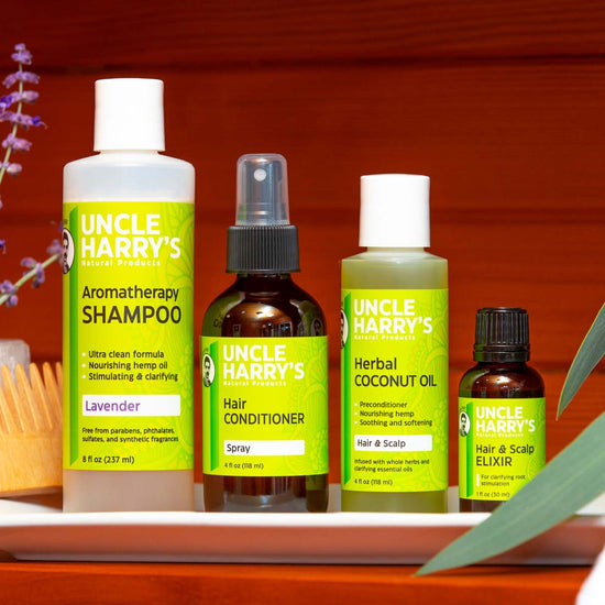 Long before the modern day cream conditioner was born, coconut oil was applied to the hair prior to washing to moisturize, detangle, and emulsify dirt for easy removal. Uncle Harry’s Herbal Coconut Oil for Hair & Scalp adds nourishing botanicals and revitalizing essential oils to improve upon this traditional treatment.