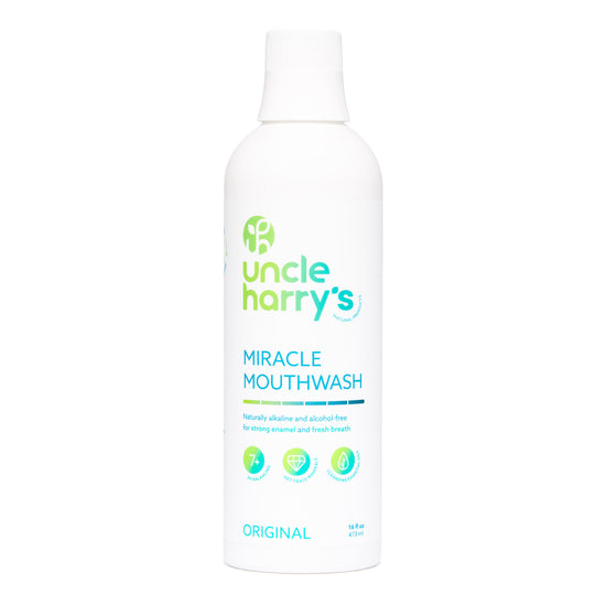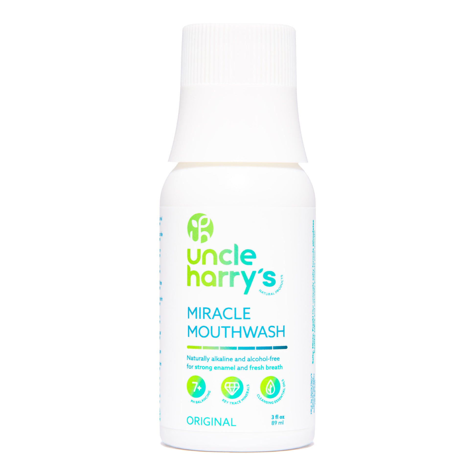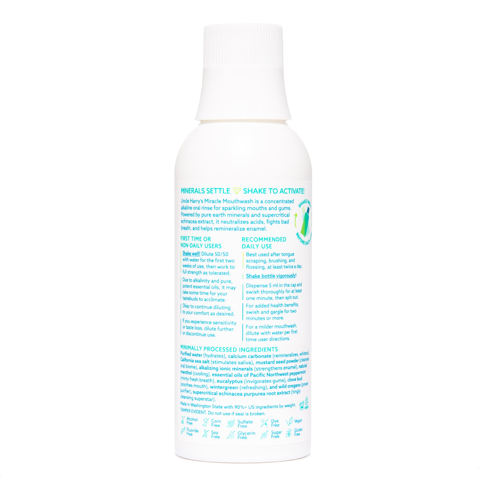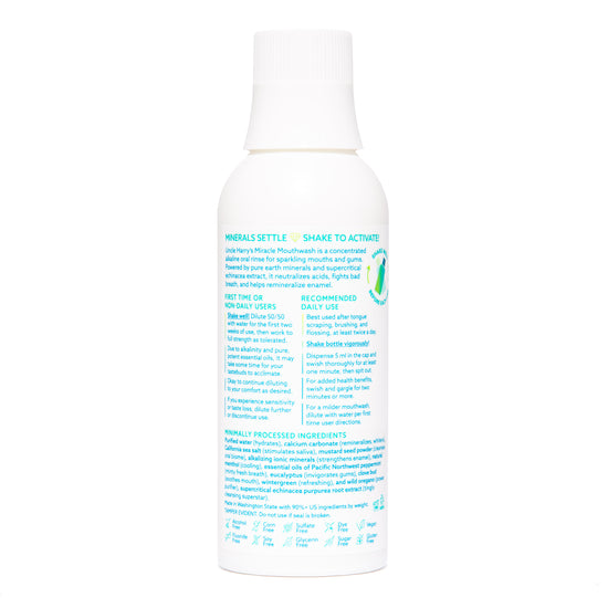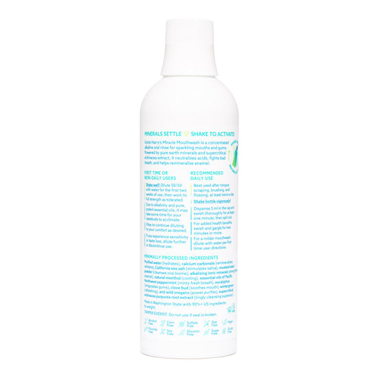 Uncle Harry's Miracle Mouthwash is made of pure, natural ingredients for fast acting freshness and oral hygiene; nothing artificial, only pure plant essences. It encourages remineralization of tooth enamel by neutralizing acids and bacteria, supplying calcium, magnesium, and phosphorus for strengthening teeth, and maintaining a naturally alkaline pH. Soothes a sore throat, freshens breath, and enlivens teeth and gums. Safe and non-toxic.
