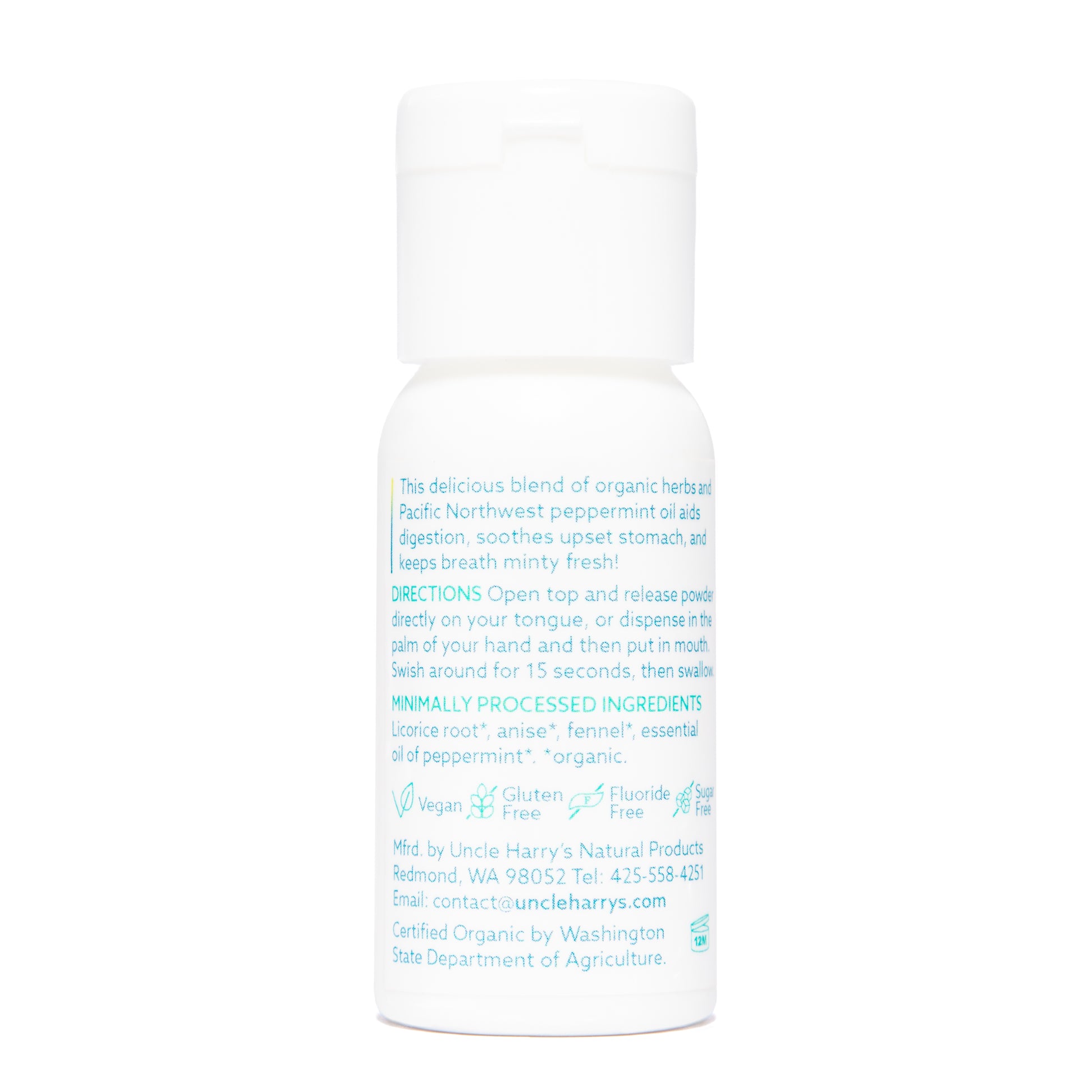 This delicious blend of organic herbs and Pacific Northwest peppermint oil aids digestion, soothes upset stomach, helps reduce bloating, and keeps breath minty fresh!