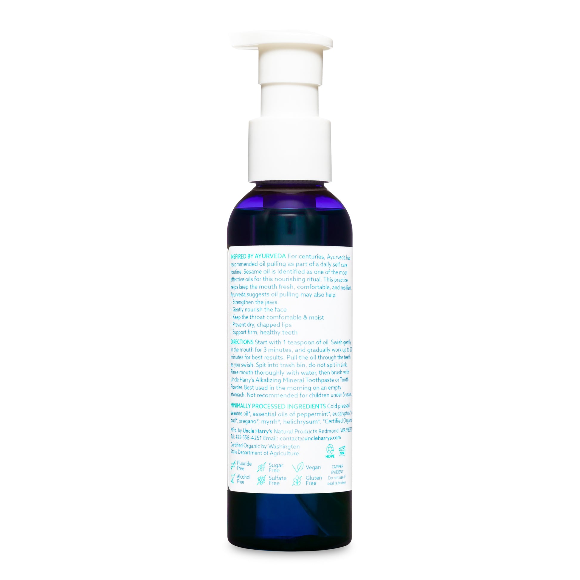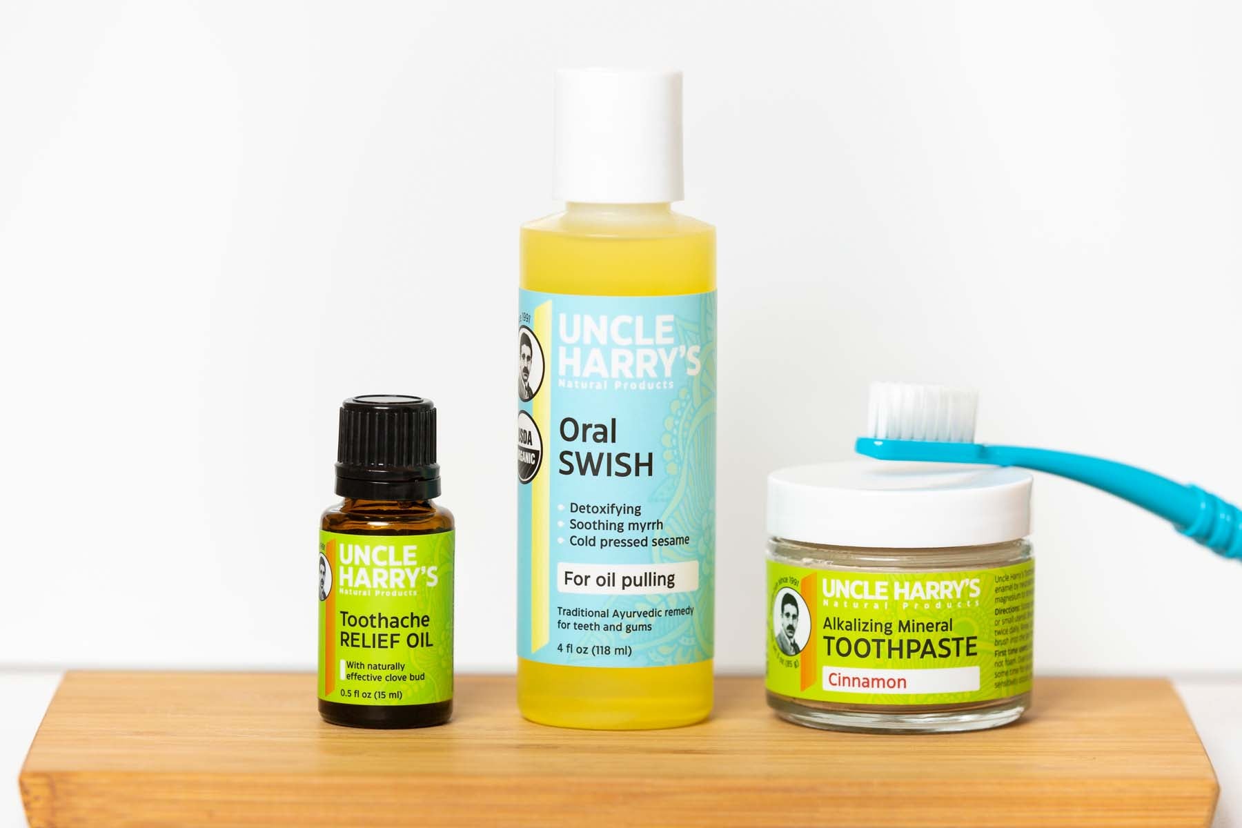Take 1 tsp (about a capful) of oil in your mouth and swish for five to twenty minutes. While swishing, pull oil through the teeth. Spit out in trash bin and rinse, then brush your teeth with Uncle Harry’s All Natural Tooth Powder or Toothpaste.