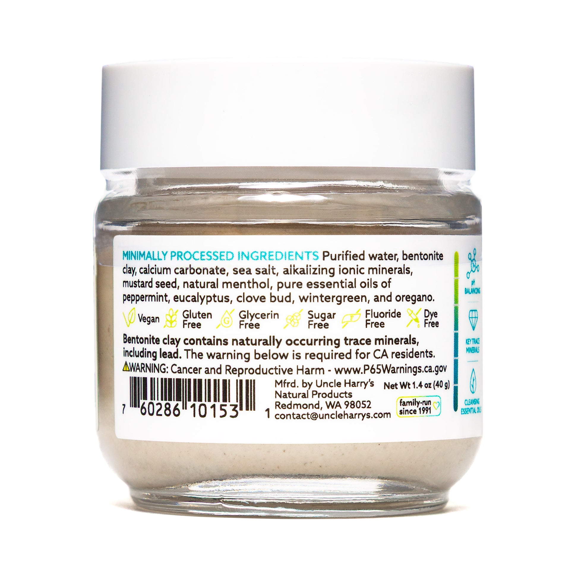 Minimally processed ingredients: Purified water, bentonite clay, calcium carbonate, sea salt, alkalizing ionic minerals, mustard seed powder, natural menthol (Mentha arvensis), essential oils of peppermint (Mentha piperita), eucalyptus (Eucalyptus globulus), clove bud (Eugenia caryophyllus), wintergreen (Gaultheria procumbens), and wild oregano (Origanum vulgare).