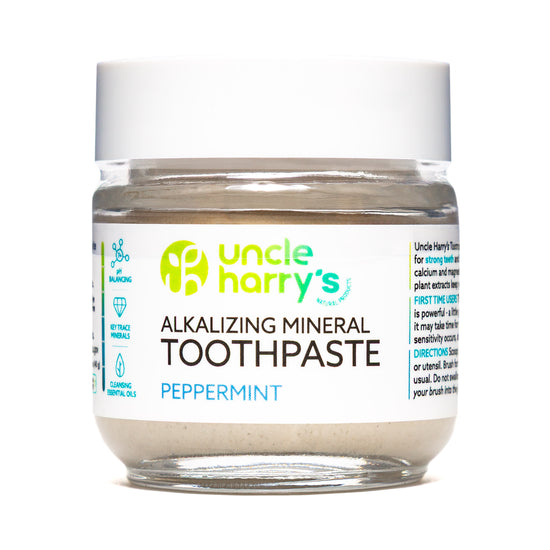 Uncle Harry’s Toothpaste encourages remineralization of tooth enamel by neutralizing acids and bacteria, supplying calcium and magnesium to strengthen teeth, and promoting an alkaline pH.