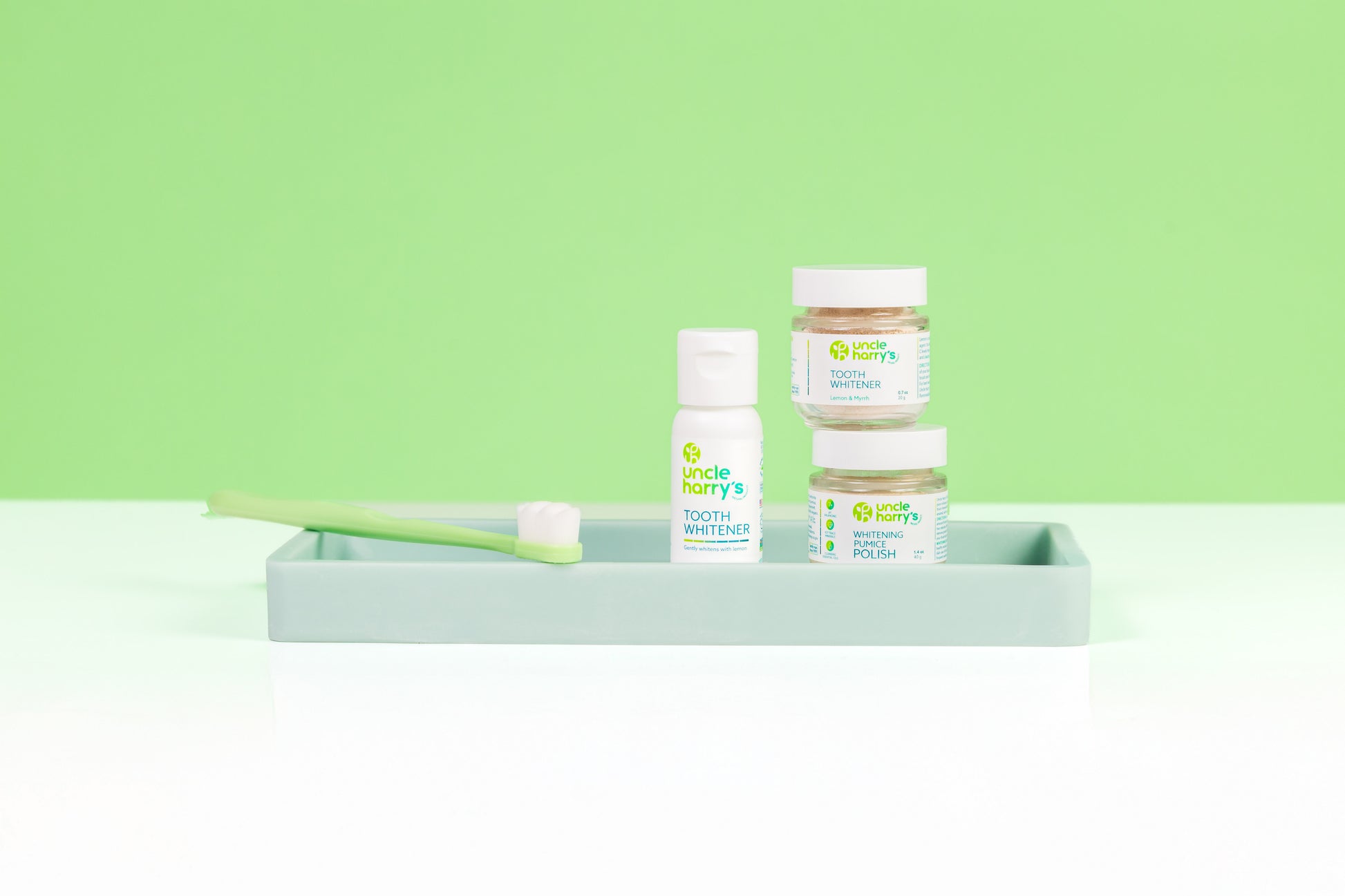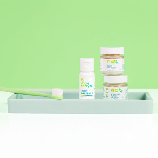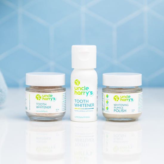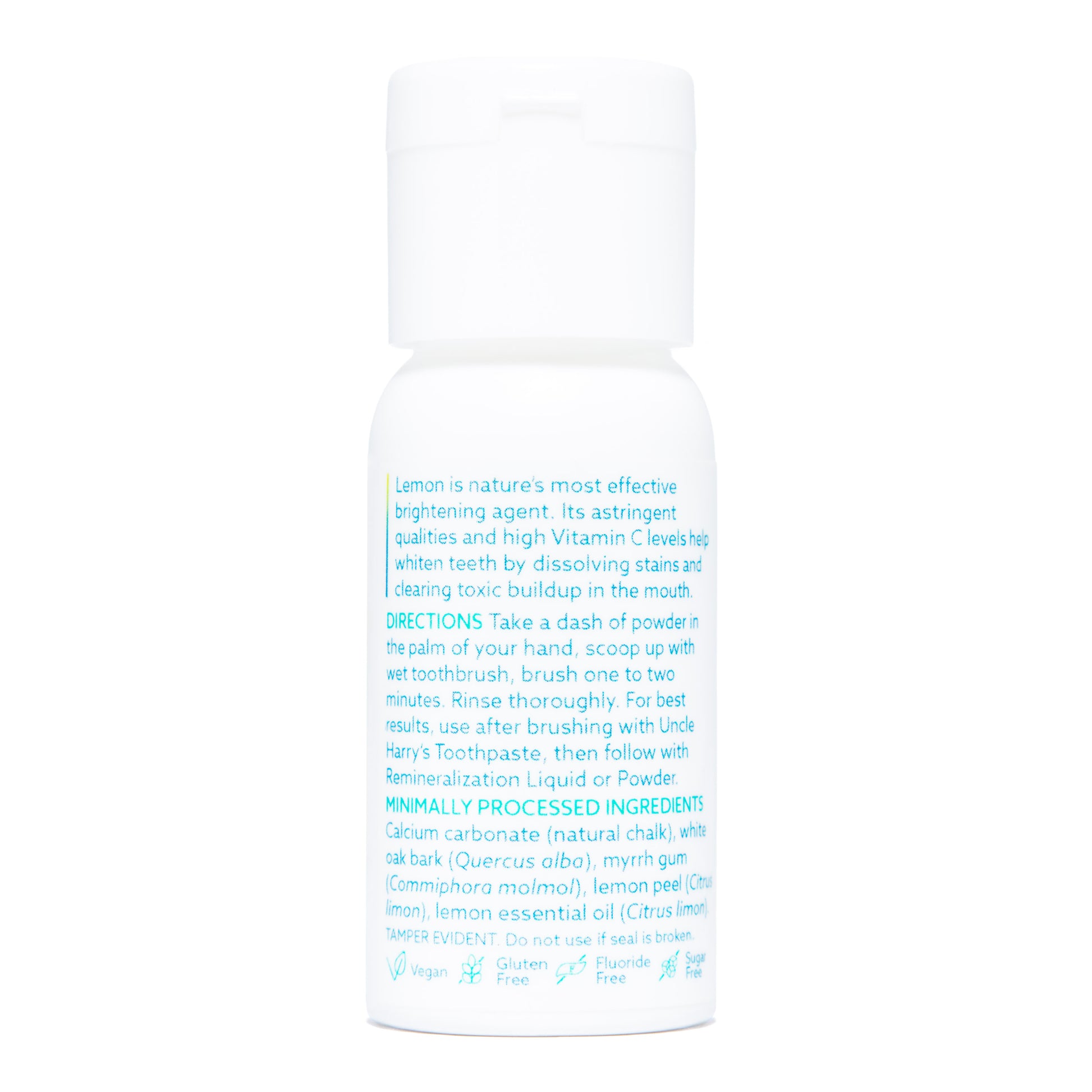 Take a dash of powder in the palm of your hand, scoop up with wet toothbrush, brush one to two minutes. Rinse thoroughly. For best results, use after brushing with Uncle Harry’s Toothpaste, then follow up with flossing and frequent swishing with Remineralization Liquid or Remineralization Powder.