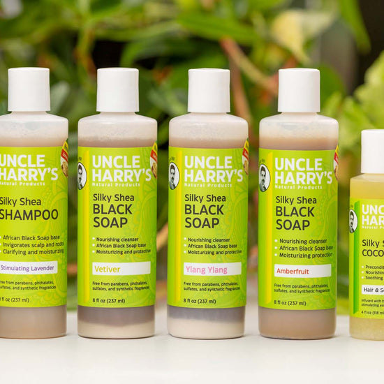 Wonderfully mild and moisturizing, African Black Soap is still handcrafted in Ghana using time-honored methods, often created and perfected by women. Leaves, bark, and other plant material are collected locally, then slowly roasted to make an ash. This natural catalyst is mixed with shea butter and other oils in a large kettle that is heated and stirred. The resulting black soap has incredible properties to deeply cleanse and protect the skin without stripping its natural oils. Uncle Harry’s Silky Shea Black Soap is enriched with organic shea butter and pure, clarifying essential oils for a soothing and complete addition to your personal hygiene routine.