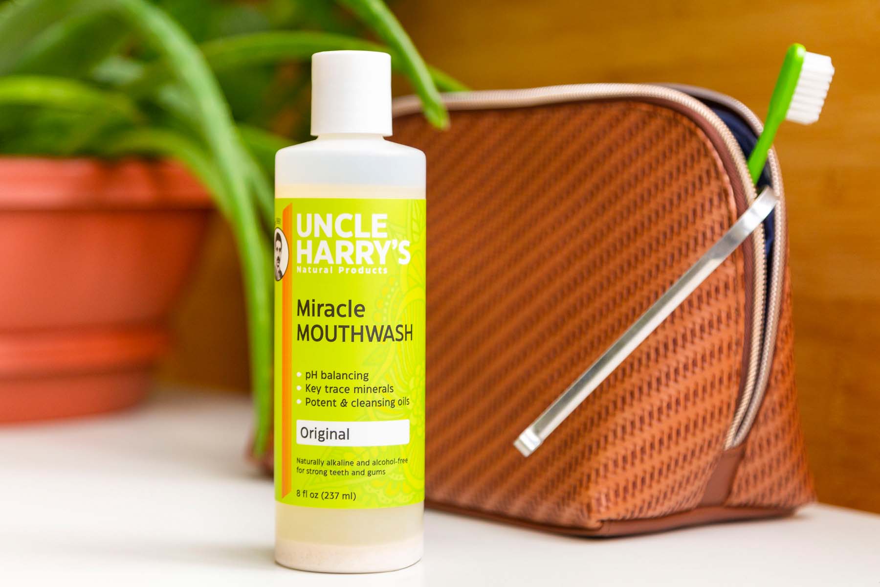 Uncle Harry's Miracle Mouthwash is made of pure, natural ingredients for fast acting freshness and oral hygiene; nothing artificial, only pure plant essences. It encourages remineralization of tooth enamel by neutralizing acids and bacteria, supplying calcium, magnesium, and phosphorus for strengthening teeth, and maintaining a naturally alkaline pH. Soothes a sore throat, freshens breath, and enlivens teeth and gums. Safe and non-toxic.