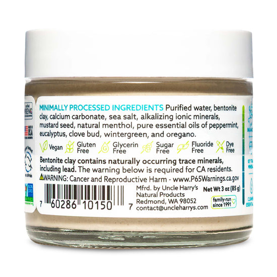 Minimally processed ingredients: Purified water, bentonite clay, calcium carbonate, sea salt, alkalizing ionic minerals, mustard seed powder, natural menthol (Mentha arvensis), essential oils of peppermint (Mentha piperita), eucalyptus (Eucalyptus globulus), clove bud (Eugenia caryophyllus), wintergreen (Gaultheria procumbens), and wild oregano (Origanum vulgare).
