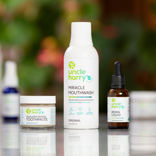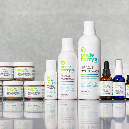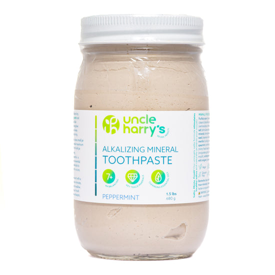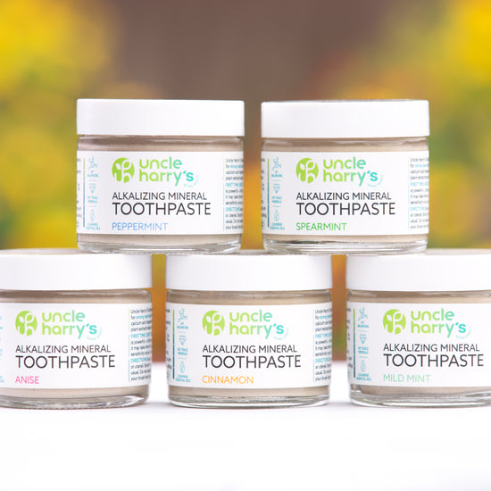 Uncle Harry’s Toothpaste encourages remineralization of tooth enamel by neutralizing acids and bacteria, supplying calcium and magnesium to strengthen teeth, and promoting an alkaline pH.