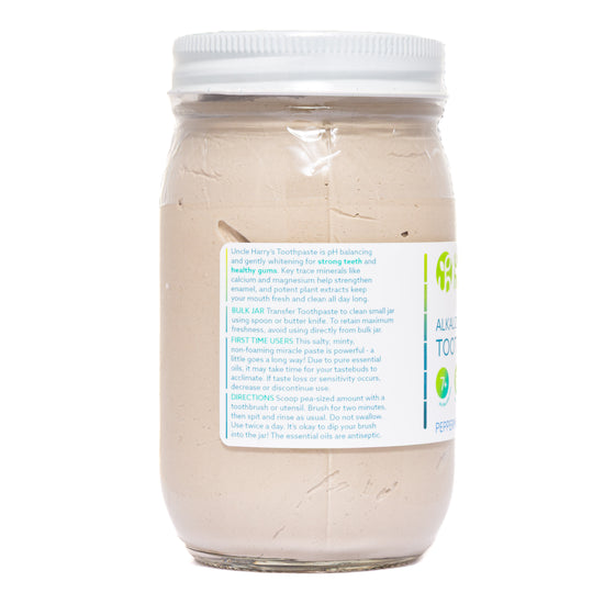 1.5 lbs glass jar - Use this bulk jar to refill your 3 oz Uncle Harry's Toothpaste jars when they run low! Limit 4 per order.